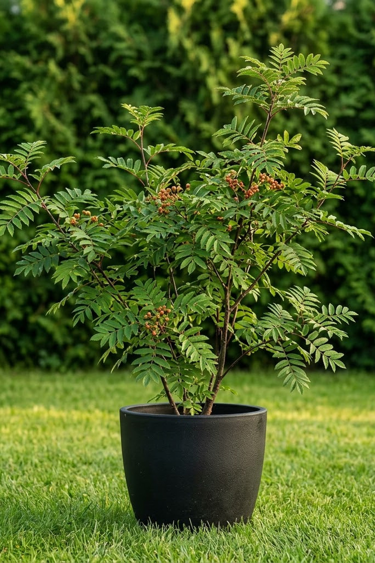 Невысокое (до 8 метров), листопадное дерево, с необыкновенно красивыми в своей осенней окраске листьями. Кора ствола гладкая, коричневатая. лист крупный, состоит из 12-15 мелких, ланцетовидных листиков. Цветет в конце мая белыми соцветиями. Плоды очень декоративные, собраны в компактные гроздья. Ягоды созревающие в больших кистях-крупные, оранжево-красные, и имеют форму груши. На солнечном месте листья осенью приобретают пламенеющую, оранжево-красную окраску. В это время растение вызывает восхищение у каждого зрителя.
