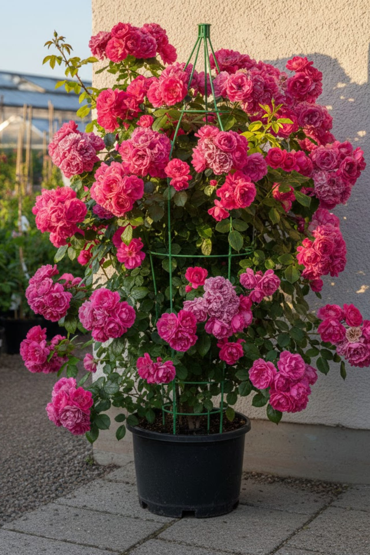 Многоцветковая раскидистая лиана.Размер цветка 8-9 см. Цветки темно-розовые, густомахровые, с чудесным ароматом, появляются в крупных кистях по 5-15 шт